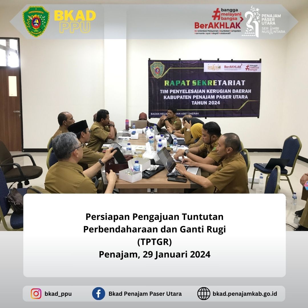Senin, 29 Januari 2024. Dalam rangka percepatan penyelesaian kerugian daerah dan pelaksanaan pengajuan tuntutan perbendaharaan dan tuntutan ganti rugi (TPTGR) di lingkungan Pemerintah Kabupaten Penajam Paser Utara, maka dilakukan rapat majelis (TPTGR).