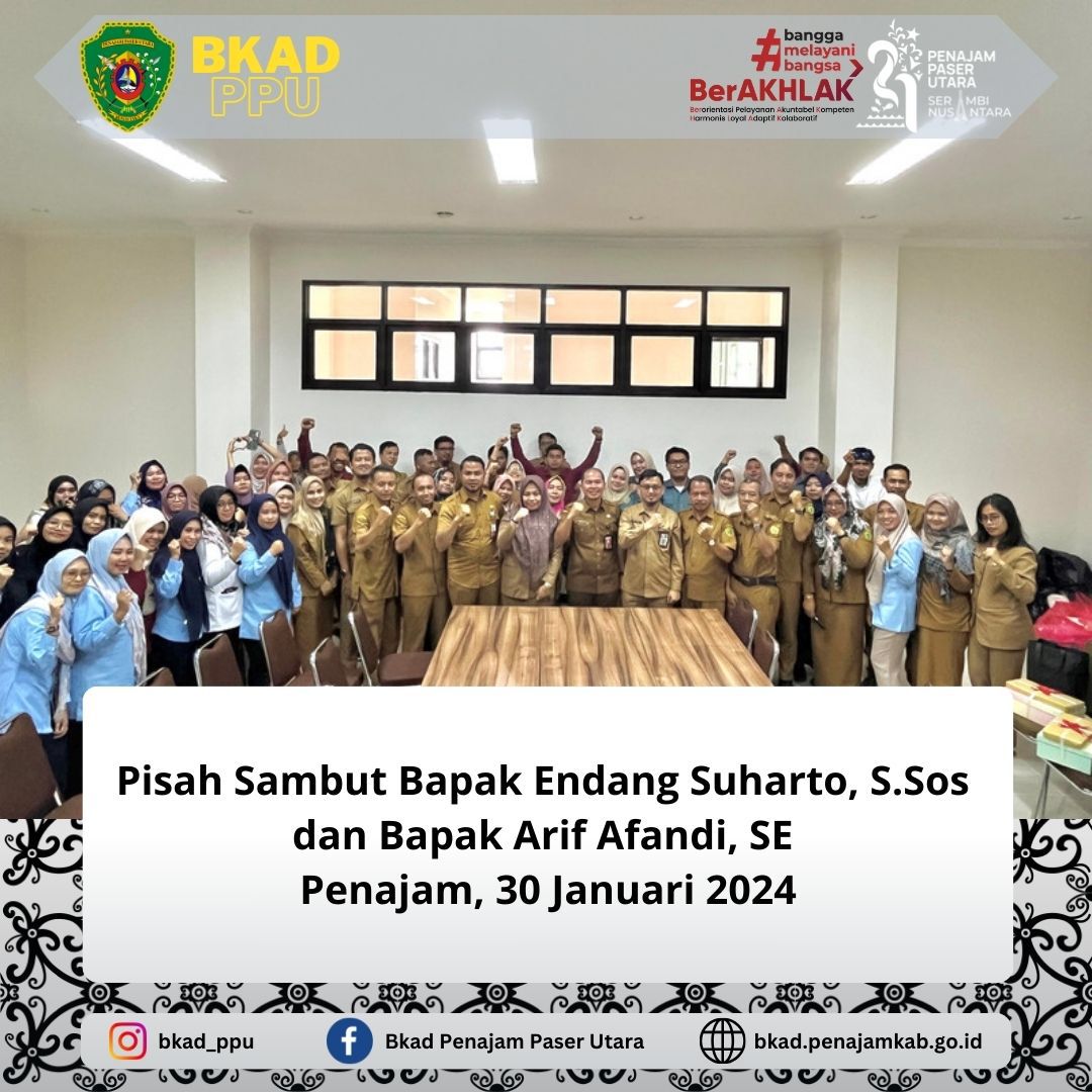 Selasa, 30 Januari 2024. Selamat dan sukses kepada Bapak Arif Affandi dan Bapak Endang Soeharto ditempat yang baru, Terimakasih atas Dedikasi, Pengabdian, dan Sinergi selama berada di Badan Keuangan dan Aset Daerah Kabupaten Penajam Paser Utara. Semoga Senantiasa diberikan Keberkahan, Kesehatan, dan Kesuksesan, Amin.