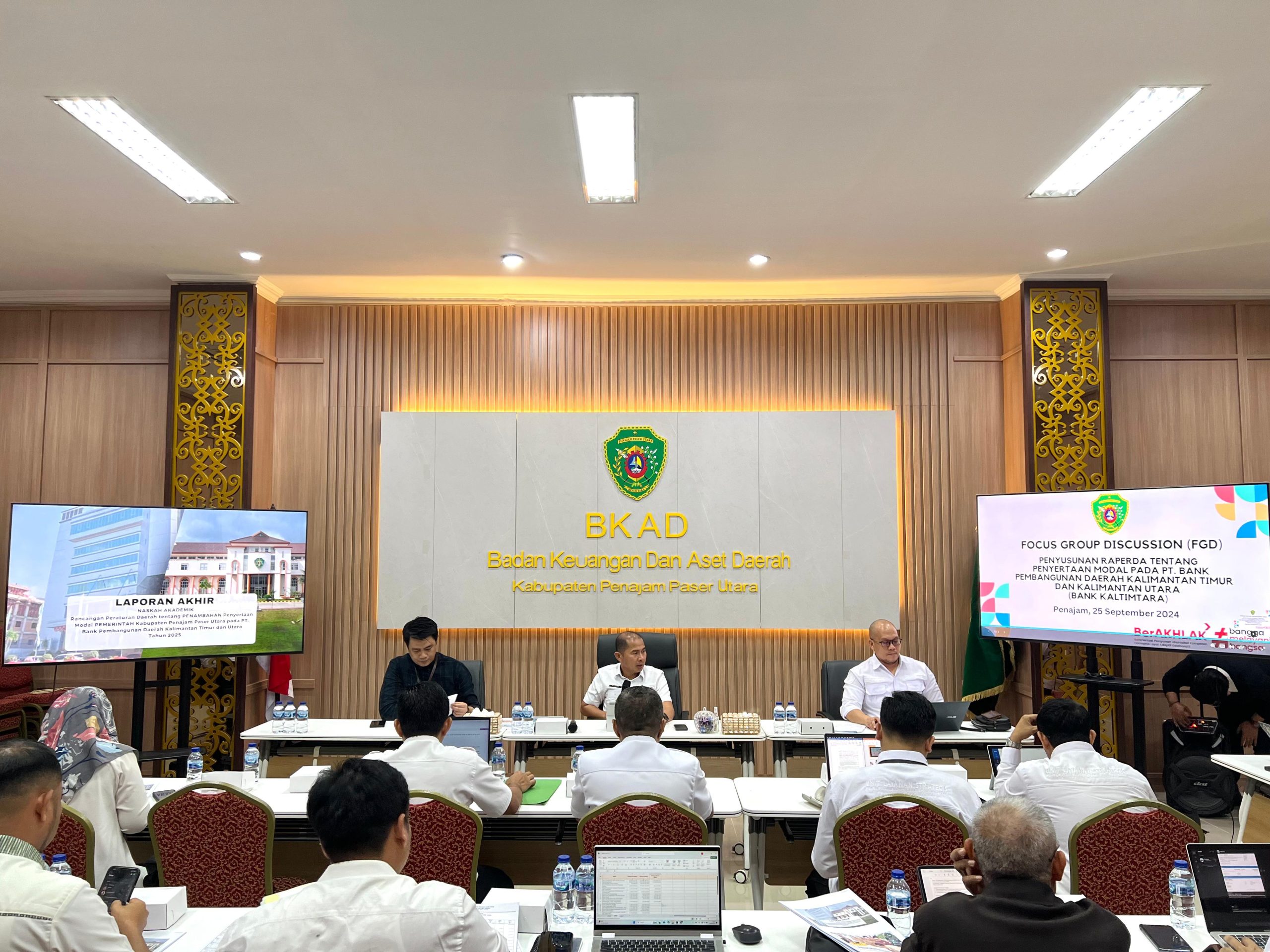 Pertemuan ini membahas finalisasi penyusunan Naskah Akademik Rancangan Peraturan Daerah tentang Penambahan Penyertaan Modal pada PT. Bank Pembangunan Daerah Kalimantan Timur dan Utara yang dipimpin oleh Kepala BKAD dan dihadiri oleh Tim Penyusun Naskah Akademik, Asisten Perekonomian dan Pembangunan atau yang mewakili, Asisten Administrasi Umum atau yang mewakili, Inspektur Daerah atau yang mewakili, Kepala Bapelitbang atau yang mewakili, Kabag Perekonomian, Kabag Hukum atau yang mewakili, serta Pimpinan Bank Kaltimtara Cabang Penajam.