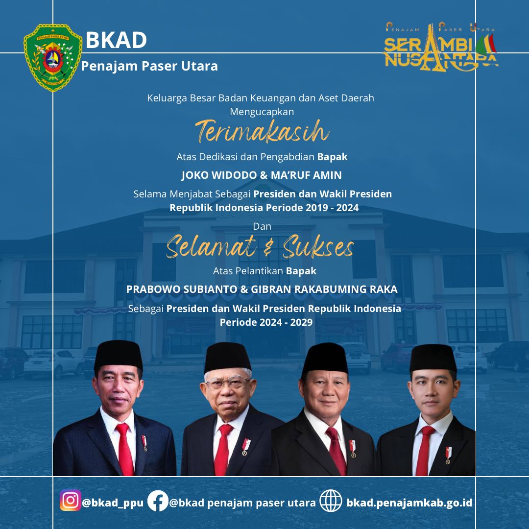 Keluarga Besar badan Keuangan dan Aset Daerah Mengucapkan Terimakasih Atas Dedikasi Bapak Joko Widodo & Ma’ruf Amin selama menjabat sebagai Presiden dan Wakil Presiden Republik Indonesia Periode 2019 – 2024 dan mengucapkan Selamat & Sukses Prabowo Subianto & Gibran Rakabuming Raka sebagai Presiden dan Wakil Presiden Republik Indonesia Periode 2024 – 2029.