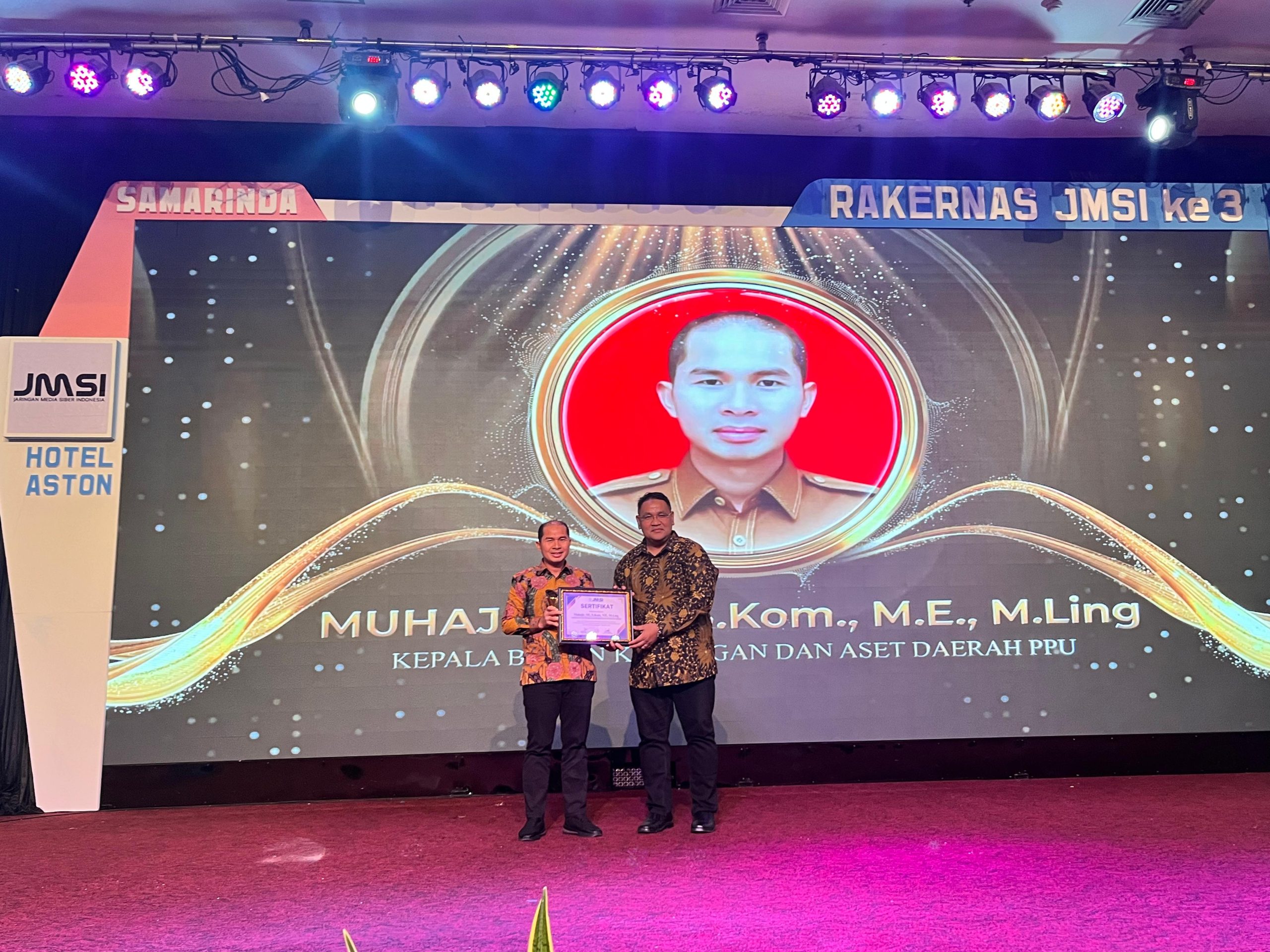 Kepala Badan Keuangan dan Aset Daerah Kabupaten Penajam Paser Utara Muhajir, SE.,S.Kom.,ME.,M.Ling menerima Penghargaan pada malam Pelantikan & Penganugerahan JMSI (Jaringan Media Siber Indonesia) Kaltim Awards 2024 sebagai “Tokoh Inovator Pengelolaan Transparansi Anggaran Daerah” Senin, 16 Desember 2024.