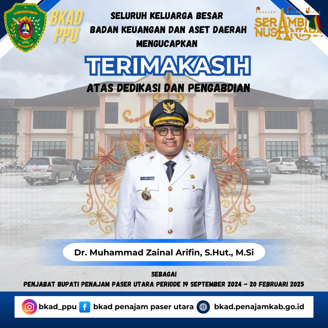 Seluruh Keluarga Besar Badan Keuangan dan Aset Daerah mengucapkan Terimakasih atas Dedikasi & Pengabdian Bapak Dr. Muhammad Zainal Arifin, S.Hut., M.Si sebagai Penjabat Bupati Kabupaten Penajam Paser Utara Periode 19 September 2024 – 20 Februari 2025.