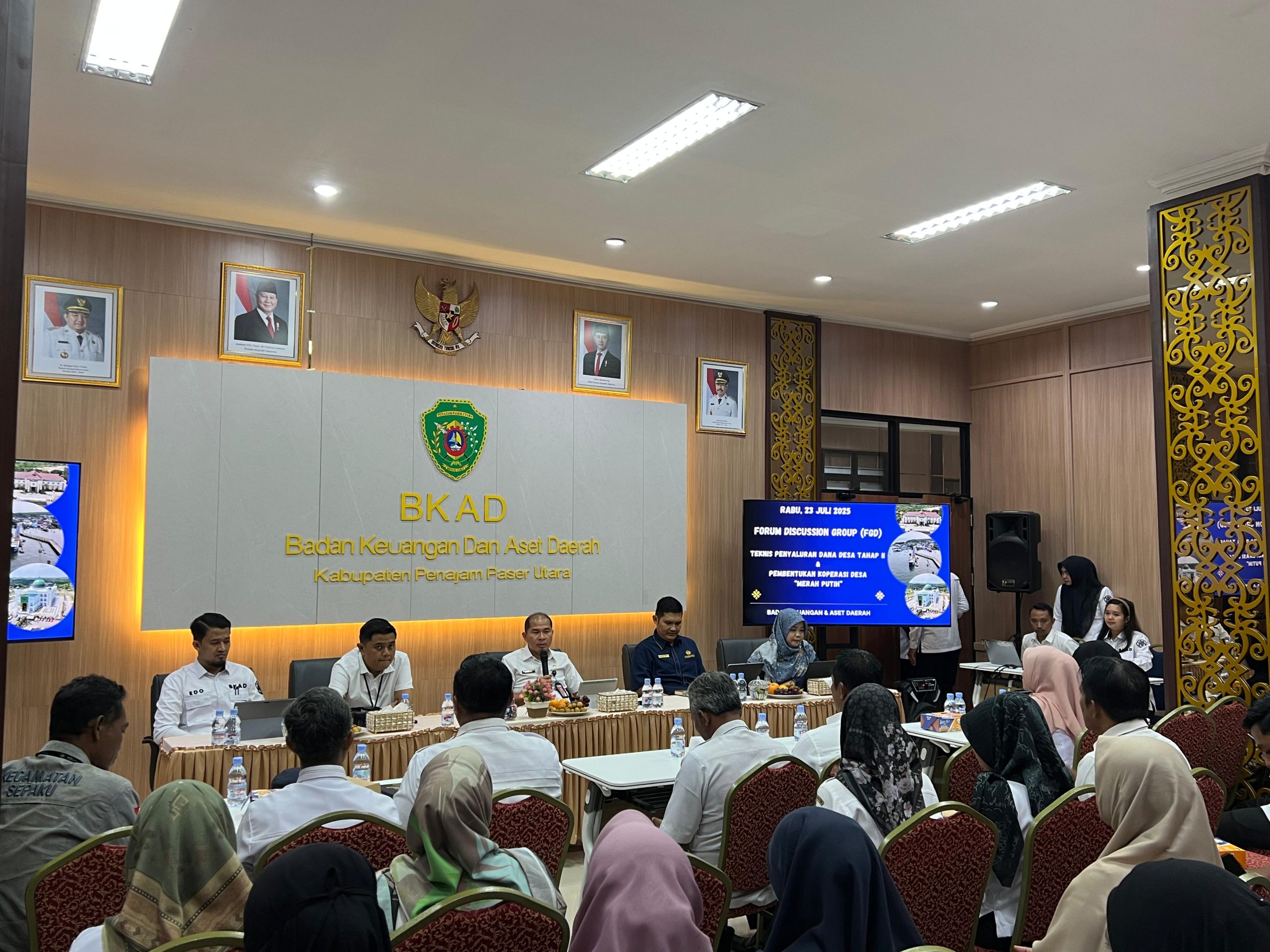 FGD (Focus Group Discussion) tentang Teknis Penyaluran Dana Desa (DD) Tahap II Tahun 2025 & Pelaksanaan Koperasi Desa Merah Putih ini dilaksanakan di ruang rapat Kantor BKAD di buka oleh Kepala BKAD didampingi oleh Kepala Bidang Anggaran BKAD dan dihadiri oleh unsur Dinas Pemberdayaan Masyarakat Desa, Camat atau yang mewakili, dan seluruh Kepala Desa atau yang mewakili di lingkungan Kabupaten Penajam Paser Utara.