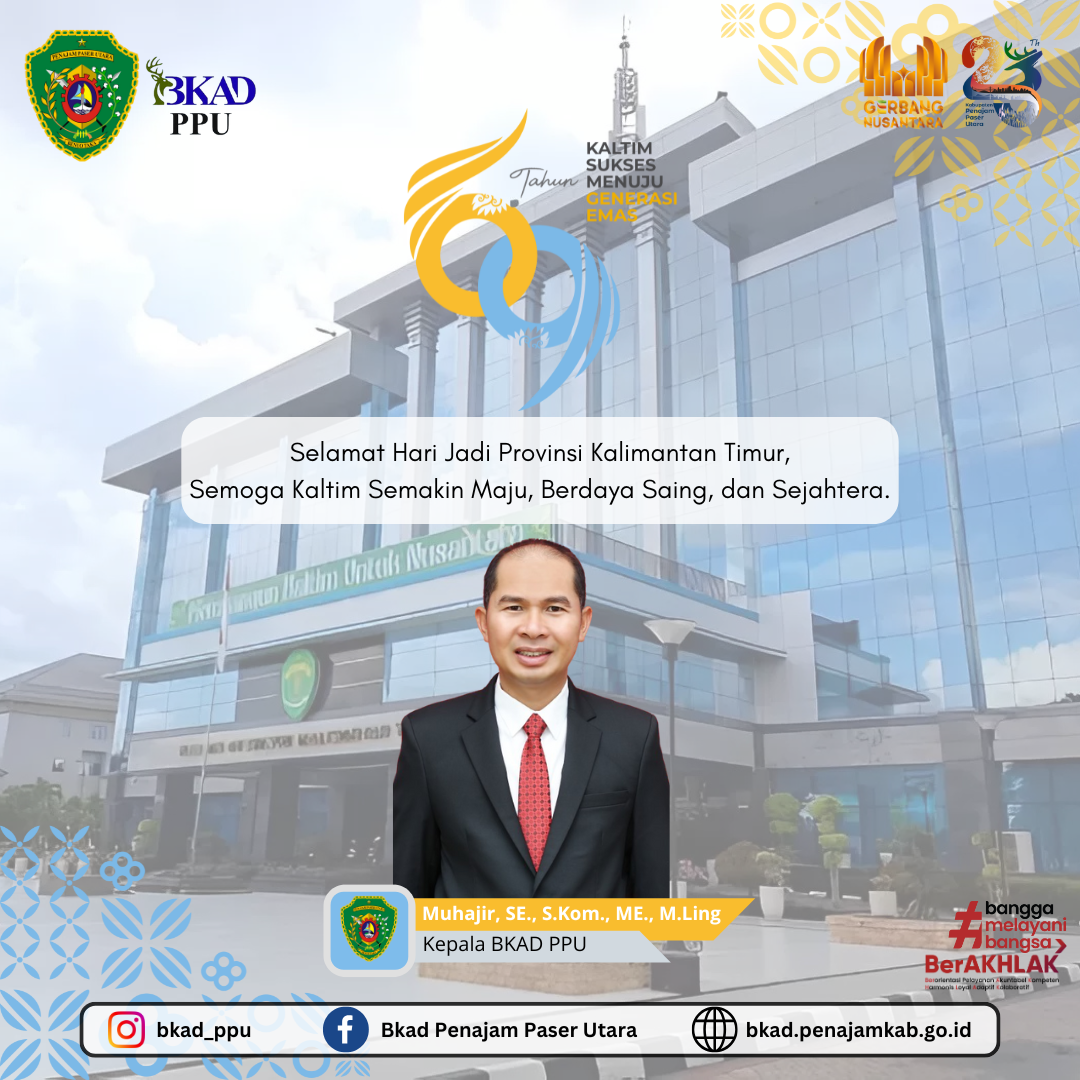 Seluruh Keluarga Besar Badan Keuangan dan Aset Daerah Kabupaten Penajam Paser Utara mengucapkan “Selamat Hari Jadi Ke-69 Provinsi Kalimantan Timur (9 Januari 2026)”.